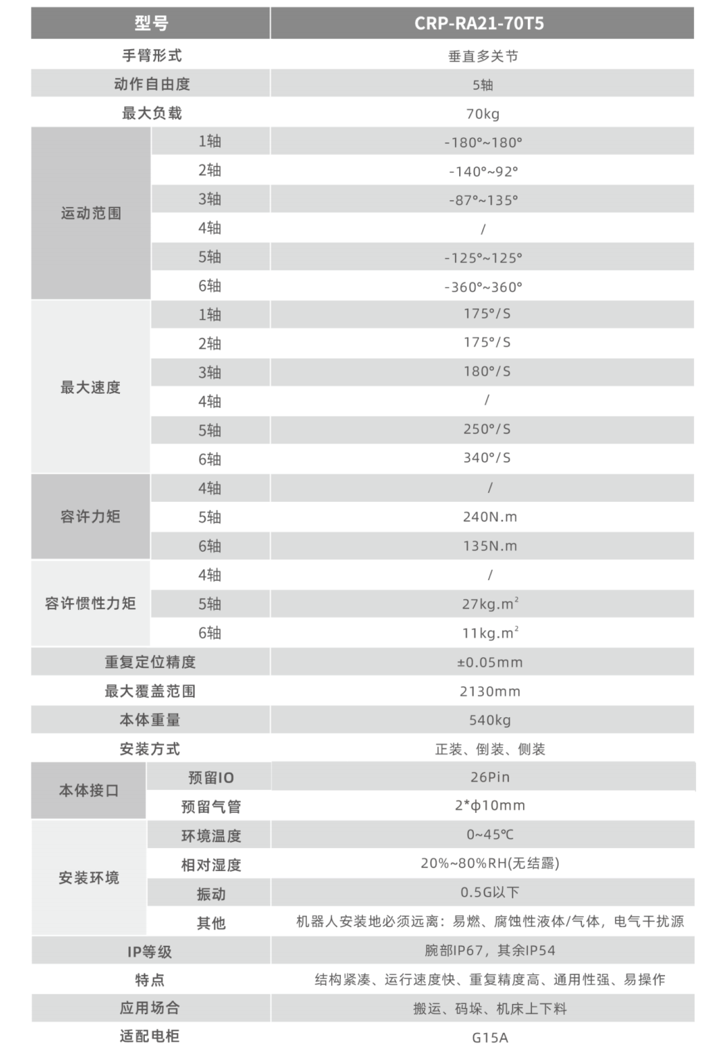 • 运行速度快,重复定位精度,适用于搬运、装配、打磨等场景。